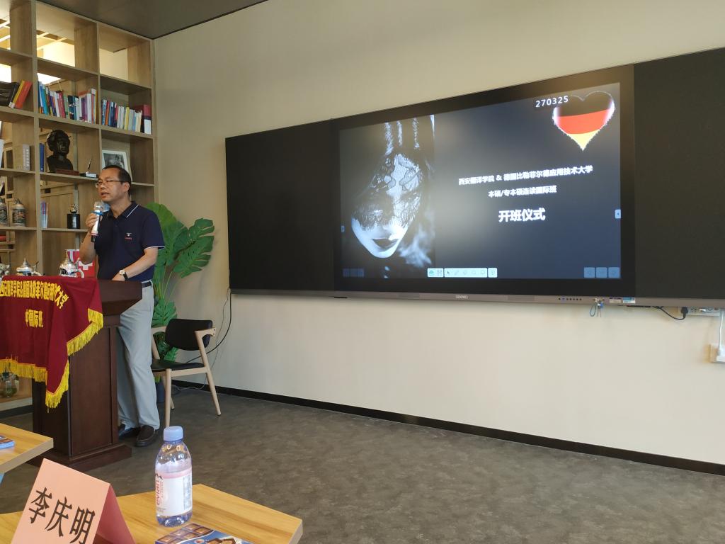 9月14日下午,MILE米乐官方网站&德国比勒菲尔德应用技术大学中德国际班开班仪式在德语体验馆举行。MILE米乐官方网站院长李庆明、国际部部长王明明、亚欧院副院长吴震、副院长卫军茹、综合办主任张青丽及外教Dirk老师参加,开班仪式由德语系主任王勃主持。