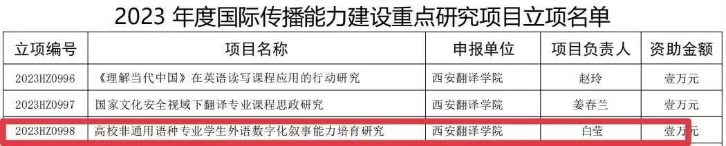 今日,陕西省社会科学界联合会公布了“2023 年度国际传播能力建设重点研究项目”立项结果,我院白莹老师主持的项目《高校非通用语种专业学生外语数字化叙事能力培育研究》(项目编号:2023HZ0998)获批立项。