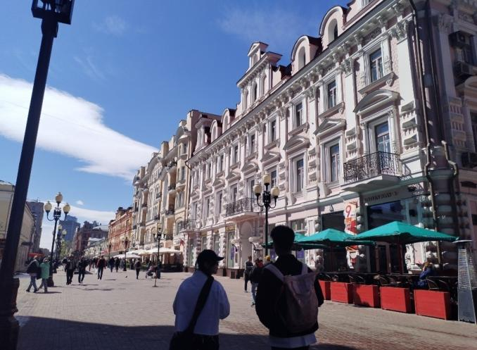 来到莫斯科之后很快喜欢上了这里的自然环境和生活方式,莫斯科的春天真的美得让人无法用言语来形容:天空蓝得纯净,不掺杂一点杂质,偶尔有几朵白云,飘得很低,给人一种在飞机上看到云朵的感觉。每天就只是看着那蓝天、那赛跑着的云朵就已经是一种享受了。莫斯科的生活节奏相对比较缓慢,并没有国内的内卷,更多的是松弛感,让人觉得很惬意。在俄罗斯,我深深地感受到了当地人民对中国人的友好和热情,不管是志愿者还是陌生人,尽管有时语言不通,但他们总是热情友好,愿意帮助我解决问题,很多俄罗斯人非常欣赏中国的文化,认为中国是一个充满活力和机遇的国家,走在路上,经常会有人热情的向我们用中文打招呼,很多地方的指示牌也都有俄语,英语和中文三种语言。