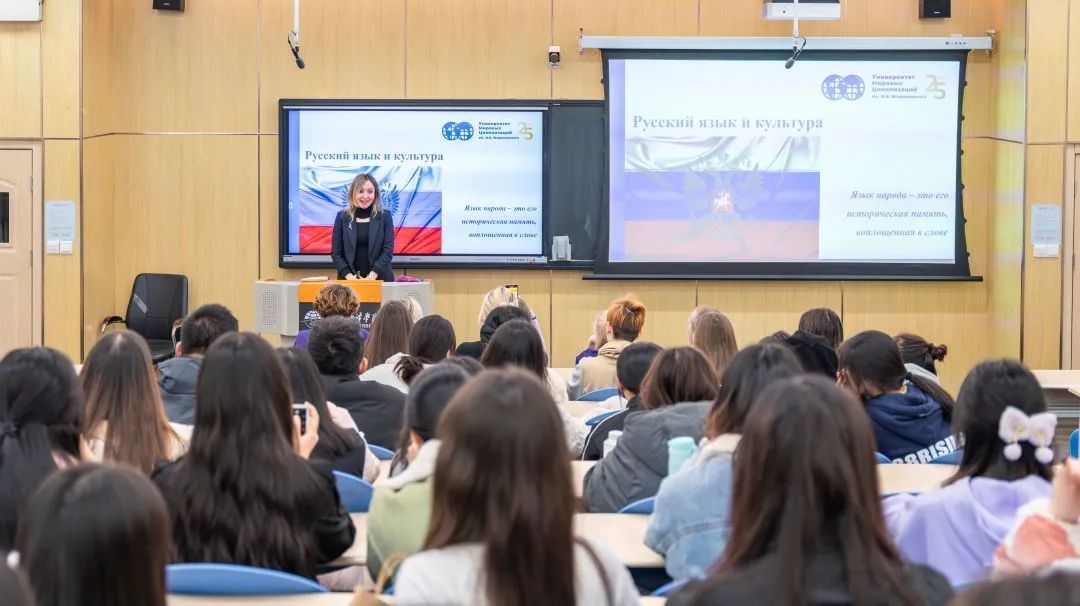 Ксения Сергеевна以俄罗斯文化为主题,从俄罗斯的文化符号、代表人物、传统礼仪、价值观等方面进行了深入浅出的讲解,让同学们更加深入地了解俄罗斯文化的内涵和特点。随后,世界文明大学汉语游学团的留学生们为大家表演精彩节目,一曲中文歌曲《日不落》拉近了中俄同学们之间的距离。我院俄语专业学生们分别表演俄语歌曲《喀秋莎》《Команда》、《月亮代表我的心》,话剧《小猪佩奇》等,同学们积极参与,互动频繁,现场气氛欢乐又和谐。