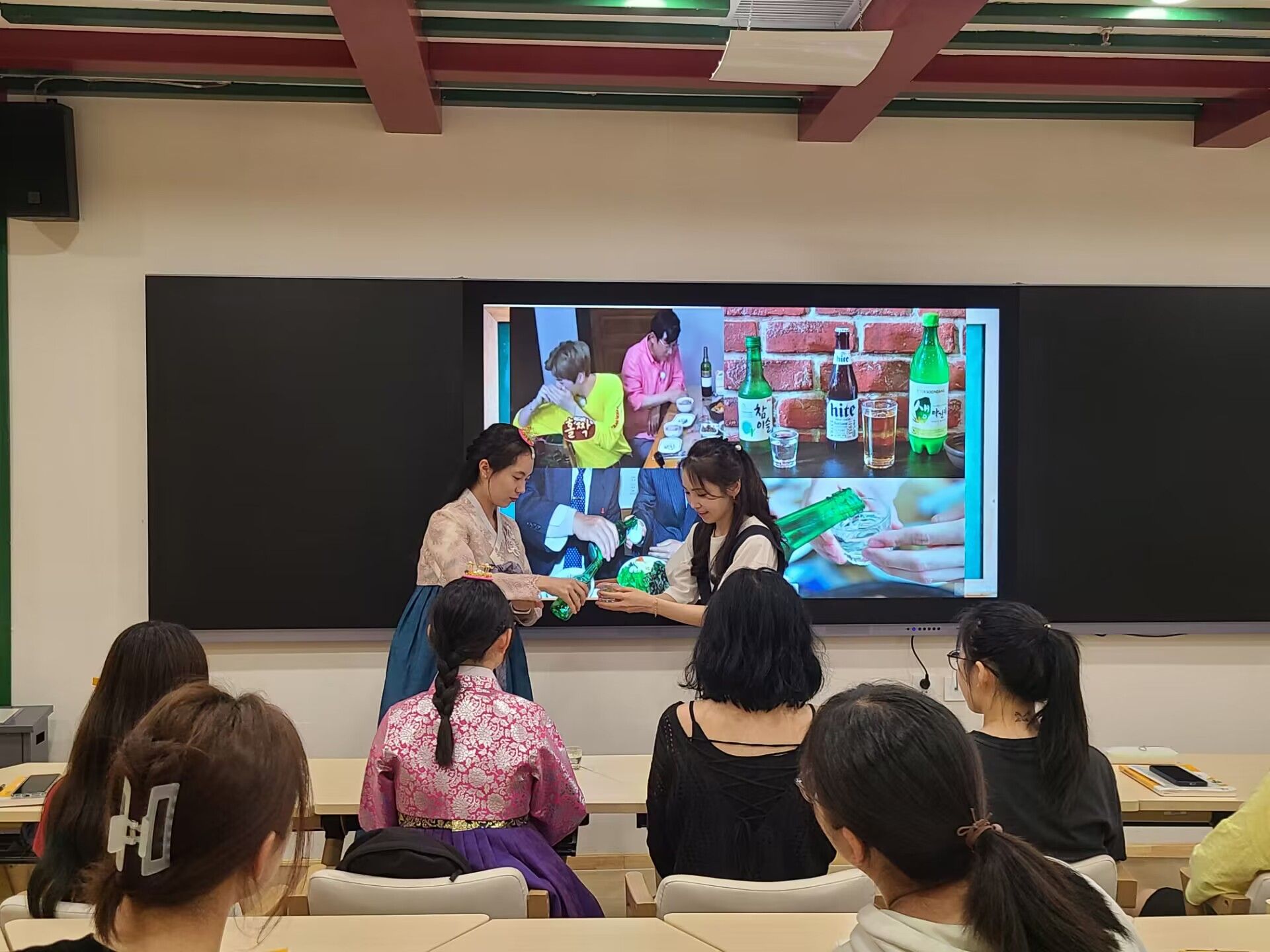 李惠真先后向学生介绍了韩服基本构成与婚礼服饰特点、韩国饮酒文化与社交礼仪、以及韩国传统乐器伽倻琴和传统民俗乐器特点。讲座中,同学们就感兴趣的话题与李惠真积极互动。
