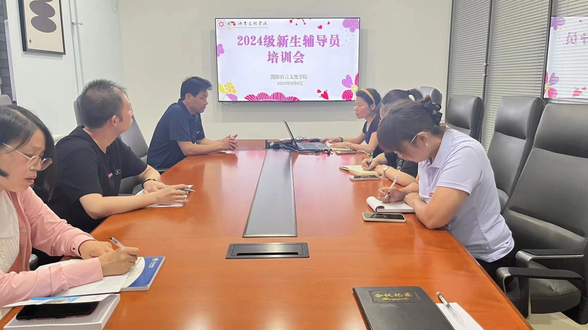 为快速提升2024级新生辅导员的教育水平和业务能力,帮助2024级新生尽快融入新环境,9月6日上午,国际语言文化学院召开2024级新生辅导员培训会。学院党委书记、副院长宇文永康,学工办主任尹娜,辅导员蒋敏、黄丽娜,2024级新生辅导员徐聪、王伊飞参会。