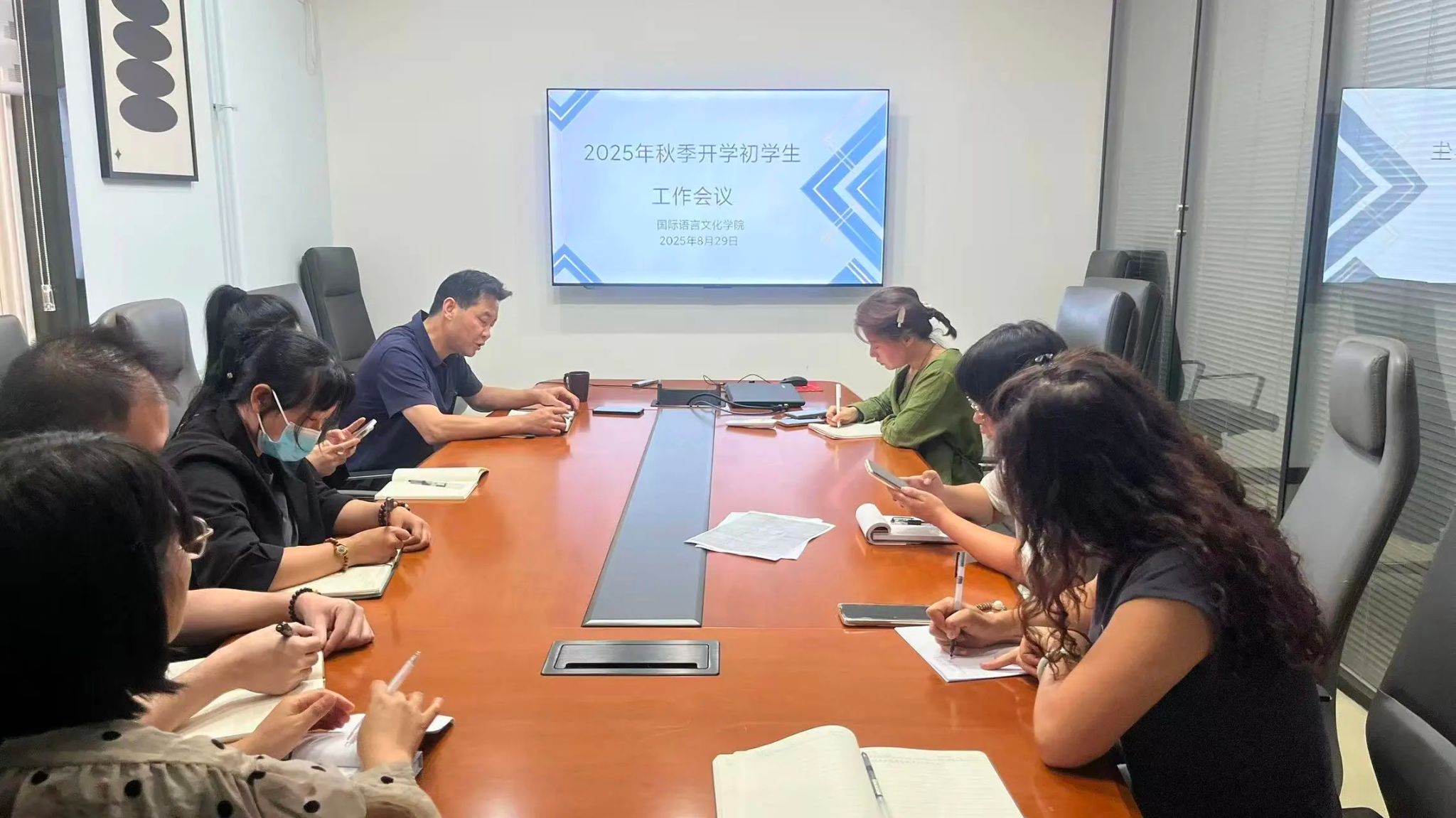 为保障秋季开学初学生返校工作平稳有序进行,8月29日下午,国际语言文化学院召开2025年秋季学期开学初学生工作会议,国际语言文化学院党委书记、副院长宇文永康,学工办主任尹娜及全体辅导员参会。