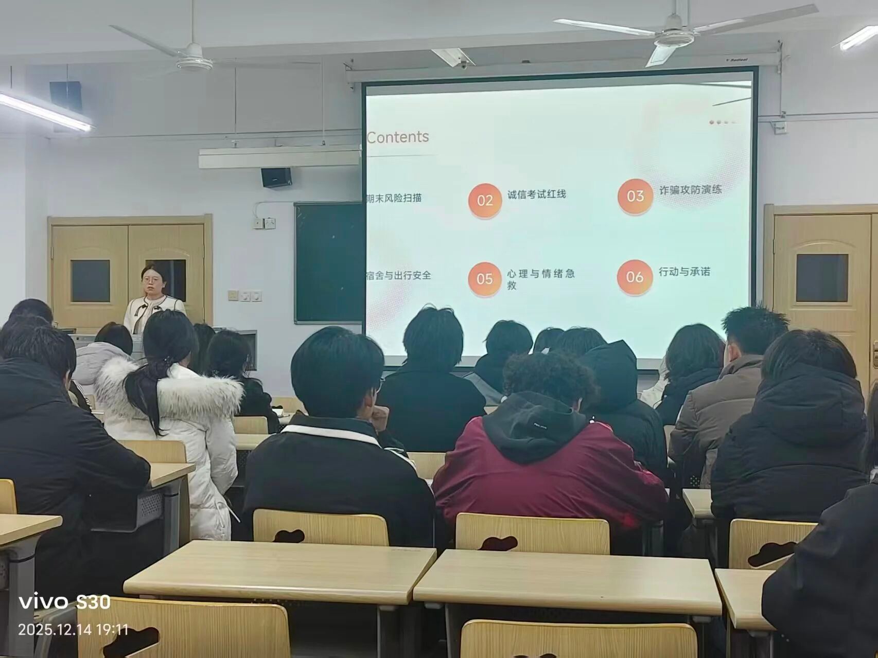 同时,班会结合期末及假期临近的时间节点,开展了全面的假期前安全教育。内容涵盖了离校宿舍安全、旅途交通安全、防范电信网络诈骗、冬季用电防火安全、饮食安全以及健康生活作息等多个方面。辅导员通过案例讲解、风险提示、互动问答等形式,帮助学生提升安全防范意识和自我保护能力,确保学生能够平安、顺利地完成学期末的各项任务,并为即将开始的假期做好充分准备。
