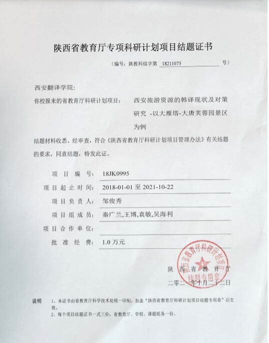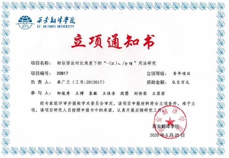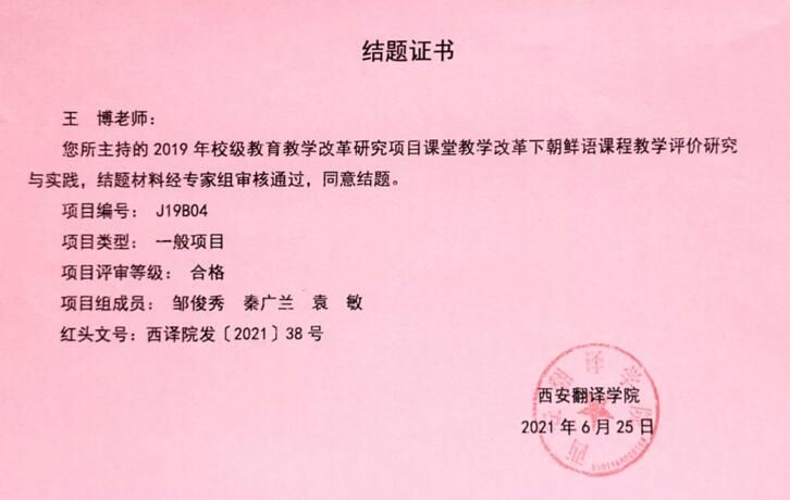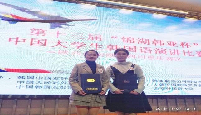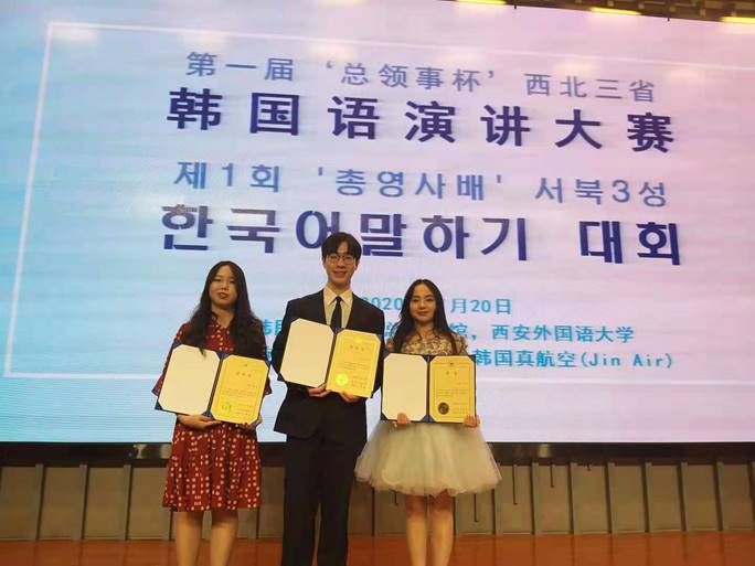 朝鲜语专业学生参加各种专业资格证考试,其中韩国教育部举办的韩国语能力考试中高级过级率达80%以上,参加教育部承办的朝鲜语专业四级考试过级率达90%以上。另外,2019级周亦可、张珂辉、潘柳婷在第三届“总领事杯”西北三省韩国语演讲大赛中获得铜奖;2019级陈静在第十四届山东省大学生科技节科技翻译大赛中二等奖;2018级王佳音在第二届中韩大学生演讲比赛中获得陕西赛区第二名,在第二届“总领事杯”西北三省韩国语演讲大赛中获得银奖;2018级段曌在第二届“总领事杯”西北三省韩国语演讲大赛中获得铜奖;2017级郝丹在第一届“总领事杯”西北三省韩国语演讲大赛中获得银奖。