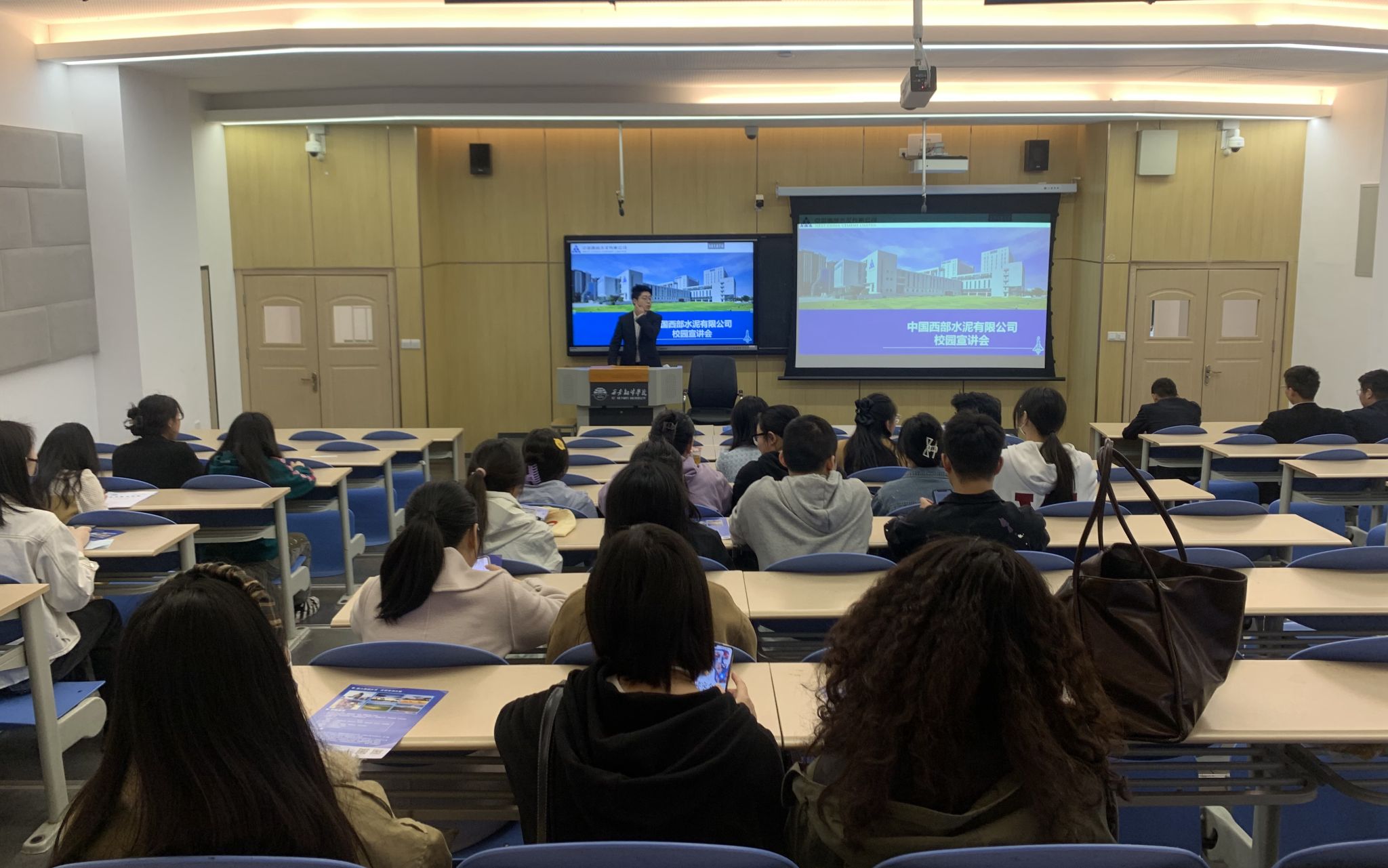 在本次宣讲会上,来自中国西部水泥集团的人力资源部王昕林详细介绍了企业发展历史、企业文化、岗位需求及储备人才培养计划等内容,使同学们对企业的基本情况有了更加直观深入的了解。