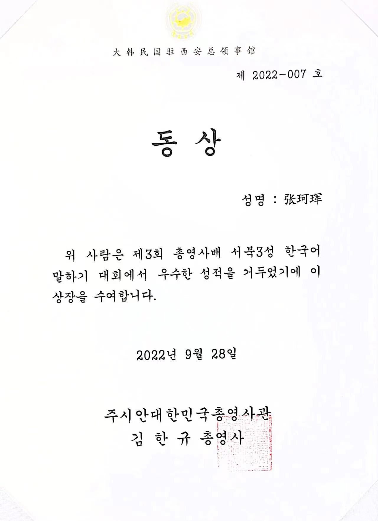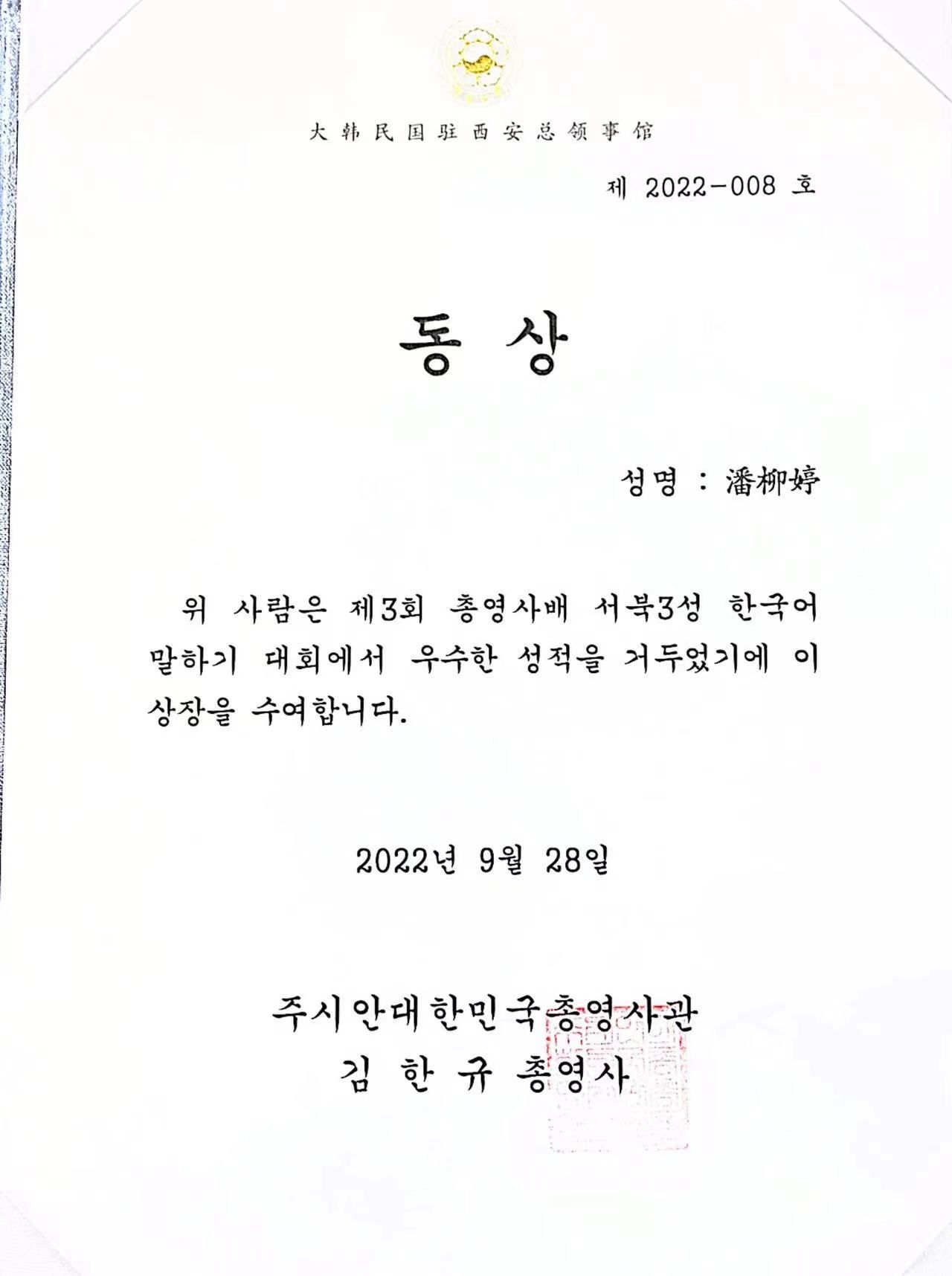 近日,由大韩民国驻西安总领事馆主办的第三届“总领事杯”西北三省韩国语演讲大赛在西安成功举办。MILE米乐官方网站朝鲜语专业2019级四名学生参赛,其中周亦可、张珂珲、潘柳婷包揽铜奖,张嘉祥获得优秀奖。