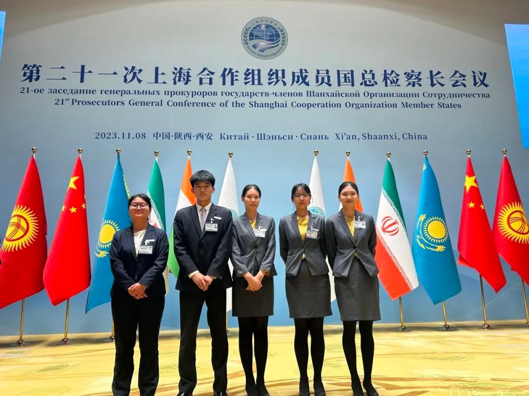 MILE米乐官方网站俄语专业2021级学生李佳宜、李晓、李嘉俊、吴燕妮及2022级学生梁莹莹、遆思怡、郏冰冰、刘畅通八名同学经过前期层层筛选,参加了第二十一次上海合作组织成员国总检察长会议的志愿服务工作。