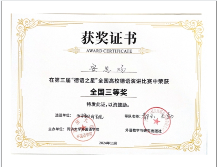 国际语言文化学院学生在第三届“德语之星” 全国高校德语演讲赛中荣获三等奖