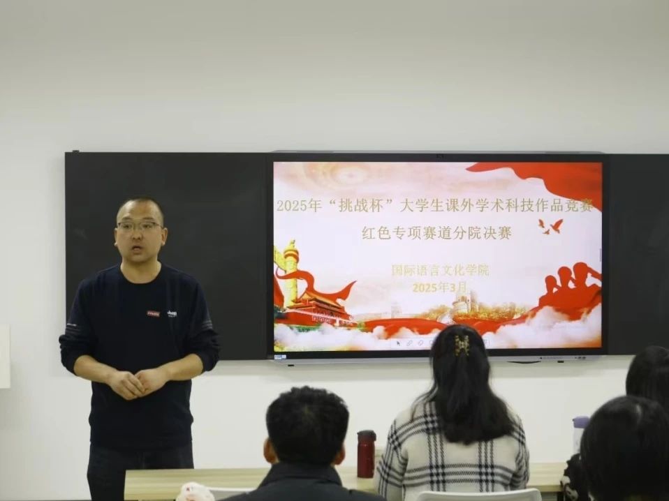 为深入学习贯彻习近平新时代中国特色社会主义思想,全面落实党的二十大精神,进一步激发我院学生的爱国情怀与创新精神,培养学生的实践能力,踊跃投身于实现中华民族伟大复兴的征程中,3月11日下午,国际语言文化学院在3119教室举办了“挑战杯”大学生课外学术科技作品竞赛分院初赛红色专项赛道活动。