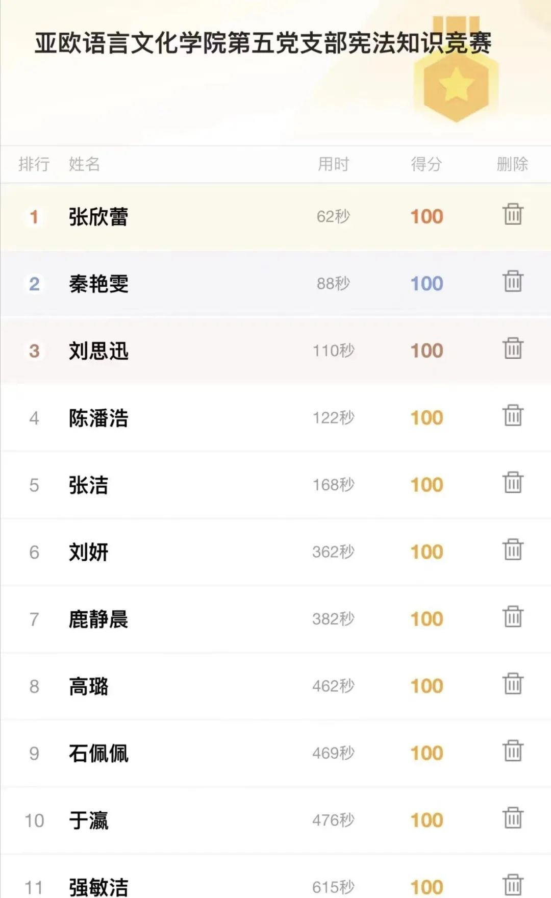 此外,MILE米乐官方网站第五党支部举办宪法知识答题竞赛。本次竞赛旨在加强大学生党员的宪法学习,提高法治素养,让大家更好地了解和运用宪法,为建设法治中国贡献力量,本次知识竞赛参与人数总计89人。截止目前,比赛已经圆满结束,每位同学都取得了十分优异的成绩。在此,我们要向所有参与竞赛的选手表示衷心的感谢和祝贺,你们都是本次竞赛的优秀代表!