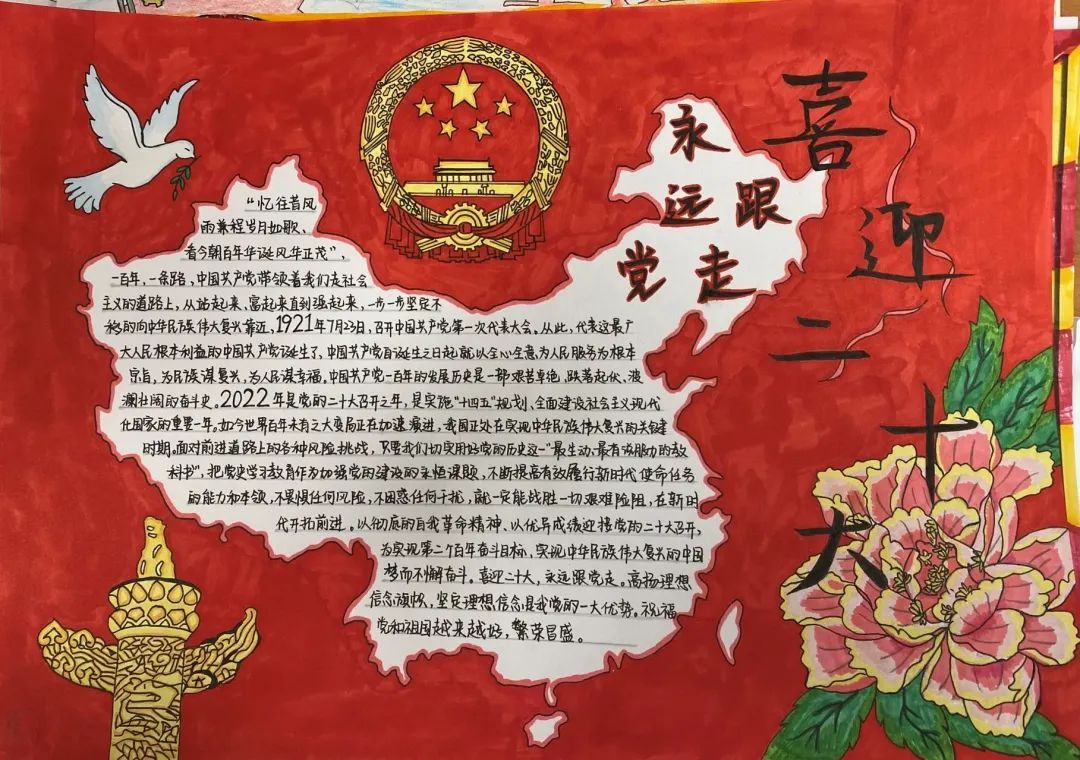 手抄报以“喜迎二十大、永远跟党走”为主题,以弘扬红色精神、宣传党的知识为主要内容,大家积极参与,围绕主题用心搜集资料,自主设计版面,尽情挥洒真情的色彩,表达了对党的热爱和祝福。