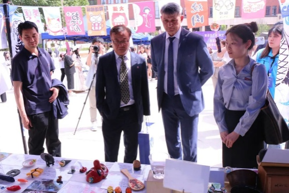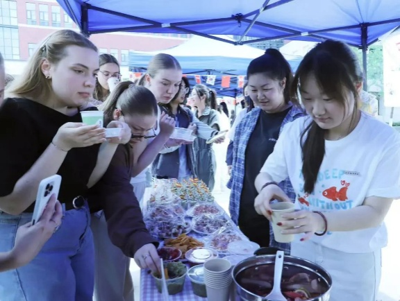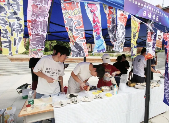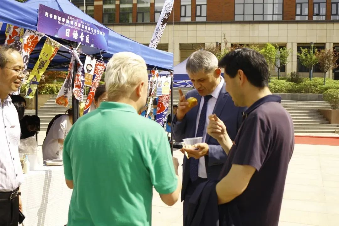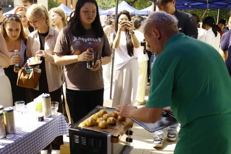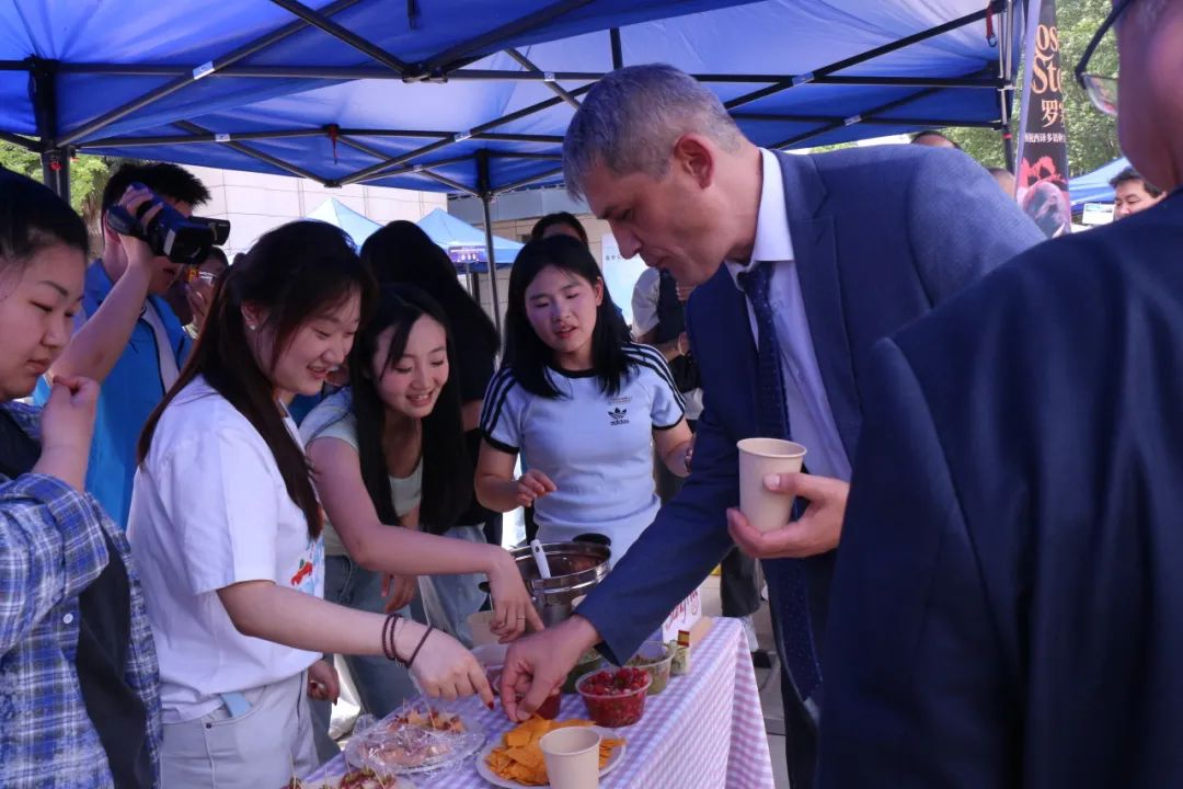 活动来到室外文化体验区,领导们品尝由学生亲手制作的各国特色美食。从精致的日式和果子、到香气四溢的卷饼,碱水面包。每一道美食都承载着不同国家的饮食文化,展现出学生们对各国文化的深入理解与实践成果。室外场所还设置了多语种展示、传统技艺体验等多个展区,丰富的活动内容吸引了众多师生驻足参与,现场学术氛围与文化气息交融,充分彰显了MILE米乐官方网站国际语言文化学院在推动多语种教育与文化交流方面的积极探索与卓越成效。