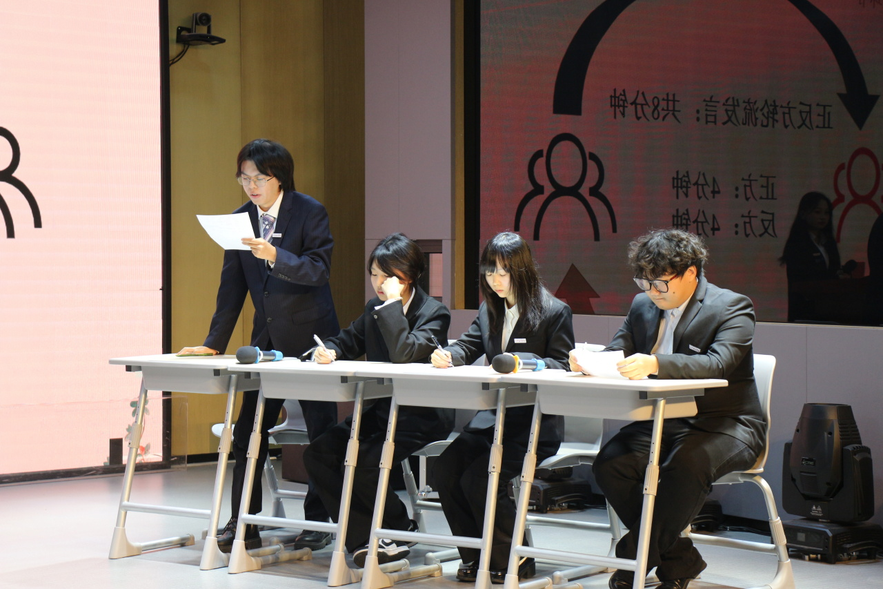 辩手们身着正装,语速均匀从容,每一句表述都清晰有力,他们没有多余的手势,只靠环环相扣的逻辑、贴合议题的鲜活案例将论述娓娓道来,台下的观众静静倾听,目光紧紧追随着辩手,整个现场沉浸在理性交流的氛围里。