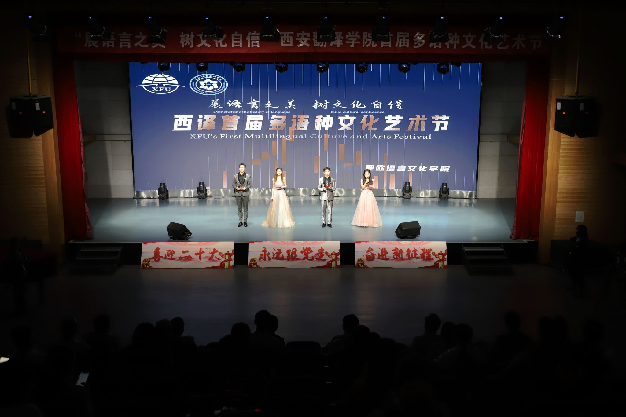 晚会在优美动听的《朝鲜语歌曲串烧》中拉开序幕。在西班牙语话剧《变色龙》中,表演者们台词娴熟、配合默契,情节扣人心弦,其精湛的演技将主人公奥楚蔑洛夫的经典形象展现得淋漓尽致,幽默诙谐的语言风格搭配精彩纷呈的舞台表现为观众带来了一场文化盛宴。诵读者们用法语朗诵文章《自由》,其吐字清晰、发音标准,字里行间充分展现了逐梦者向往远方与自由的决心,曲调间歌颂了少年们敢于逐梦的奋斗精神。非洲舞《pas comme ca》将现场气氛推向高潮,其新颖独特的舞步编排搭配律动鲜明的节奏,迸发出无限活力,表现出当代大学生努力拼搏、勇于创新的精神。