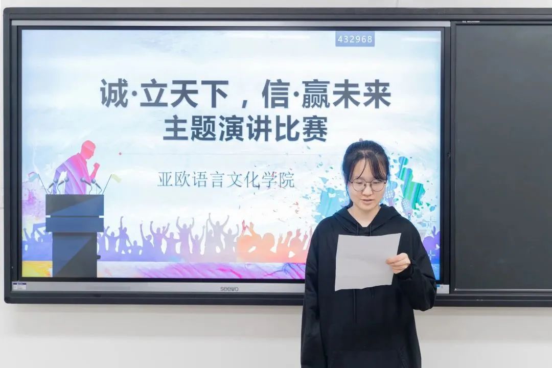 1号选手陈琪琪的演讲题目是《人不信不立,国不信不兴》。以信立身,传承古国遗风;以诚处世,光大华夏美德。深刻阐述了诚信在社会和国家建设中的重要作用,强调只有保持诚信才能赢得信任和尊重。该选手的表现让人印象深刻,言辞有力、逻辑清晰,呼吁人们坚守诚信,为社会贡献自己的力量。