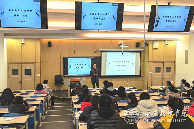 最后,院长李庆明作了总结讲话。他回顾了2021年整体工作,总结了经验,指出了不足之处,并对本学期工作做出全面部署。他说,过去的一年,在全体教职工的共同努力下,学院各项工作均稳步推进。日语专业在省级一流专业建设基础上按照要求完成各项指标,并顺利完成国家级一流专业的申报工作;法语专业获批省级一流专业值得肯定。李庆明对大家的辛勤付出表示衷心地感谢,希望全院教职工以成绩为动力,进一步发挥积极性和创造性,持续推进新一年的工作。李庆明强调,要持续提升教学质量和办学水平,不断培养教师跨学科意识,努力提升科研能力。要以“内培”为主,打造一支师德高尚、业务精湛、结构合理的人才队伍。要加强国际交流与合作,鼓励学生积极参与创新创业项目组,提高学生的综合素质和竞争能力。