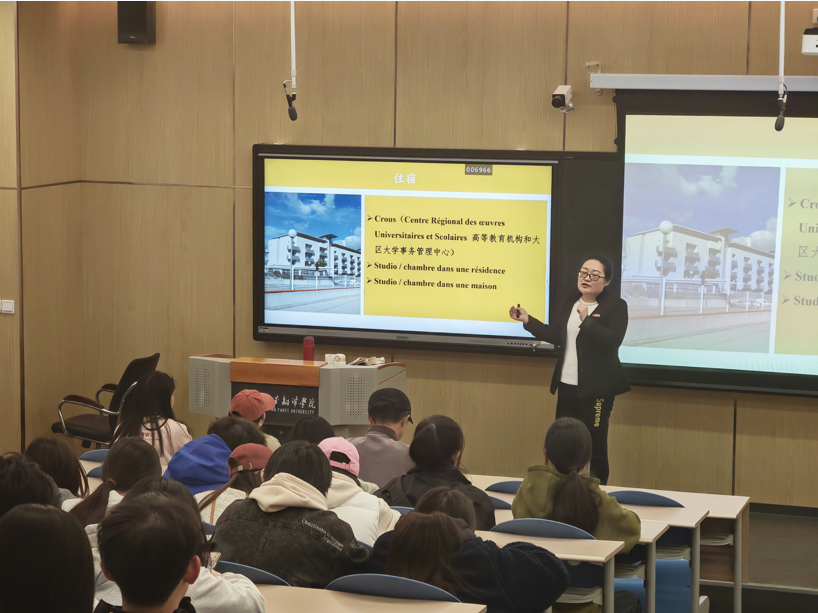 惠老师围绕留学契机、学习生活、课余生活、兼职活动等内容向学生分享了自己的留学经历。首先,她向同学们介绍了法国高等教育学制和基本费用,并向学生分享了自己的留学契机,强调了外出学习的目的和意义,表示留学可以为语言学习提供更好的环境,同学们可以根据自身的兴趣爱好及家庭条件考虑是否出国留学。