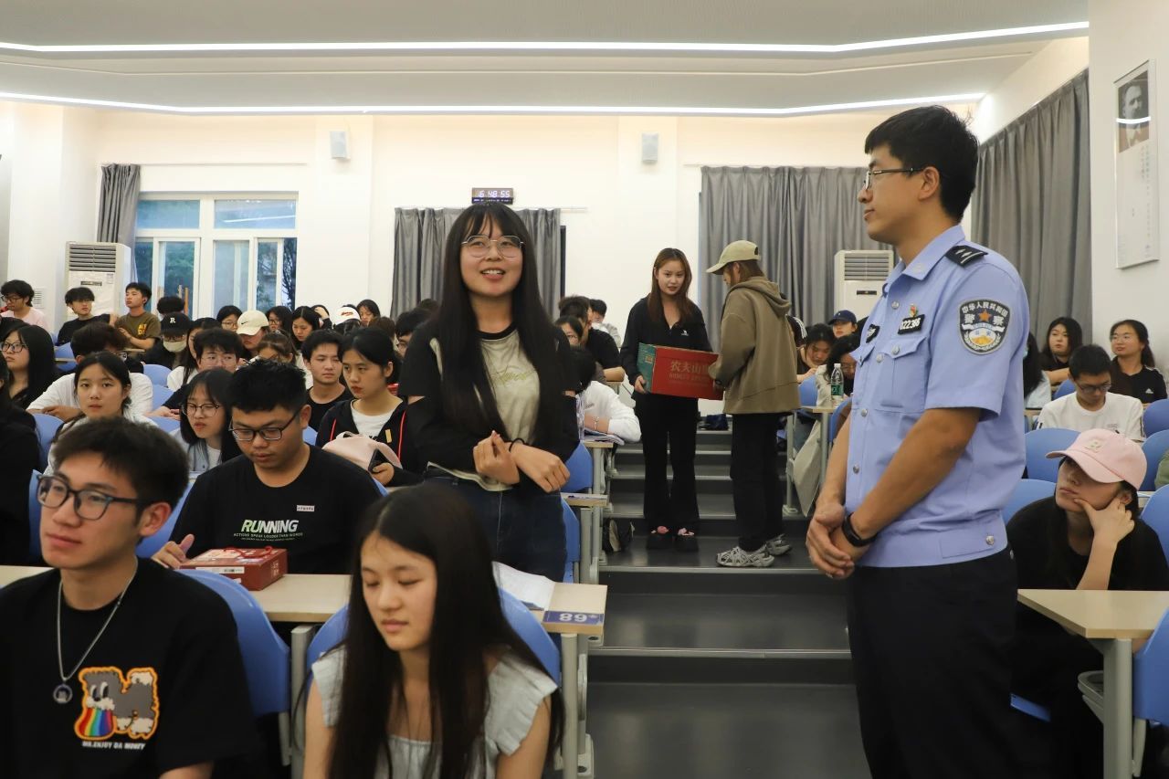 为提高学生安全防范意识,营造和谐安全的校园环境,6月6日下午,由学工部主办、国际语言文化学院和保卫处承办的“预防诈骗、护航成长”专题讲座在4211T举办。本次讲座特邀了公安长安分局太乙宫派出所社区民警、三级警长杨莉军作为主讲嘉宾,公安长安分局太乙宫派出所驻校警务工作站民警、四级高级警长刘鹏,国际语言文化学院党委书记、副院长宇文永康,学工办主任尹娜,团总支书记陈福礼及各二级学院师生代表共计170余人参加讲座。