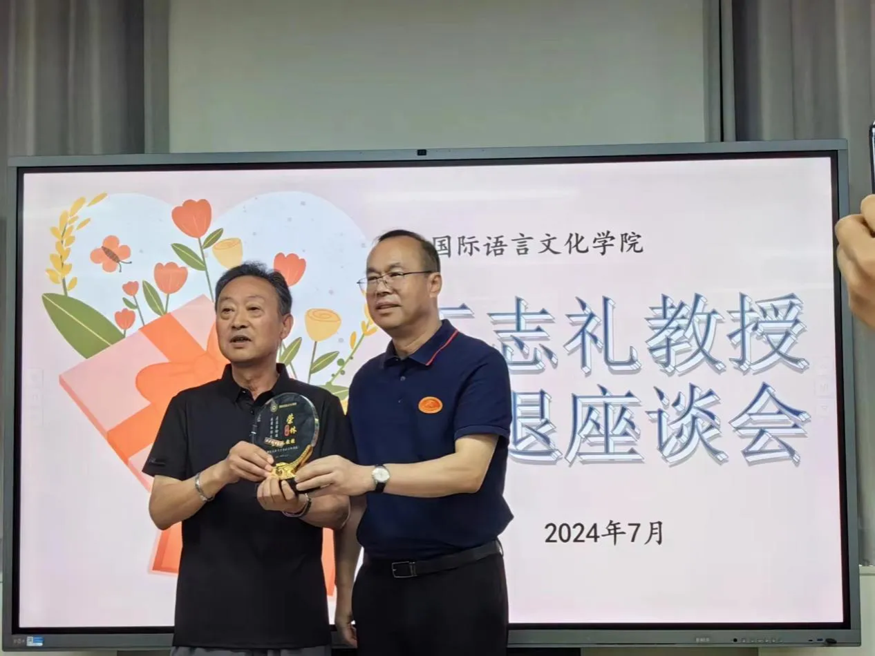 座谈会在热烈的掌声中迎来了最后一个环节——荣休仪式。学院领导为王教授颁发了荣誉奖杯和纪念品,全体教师与王教授合影留念。