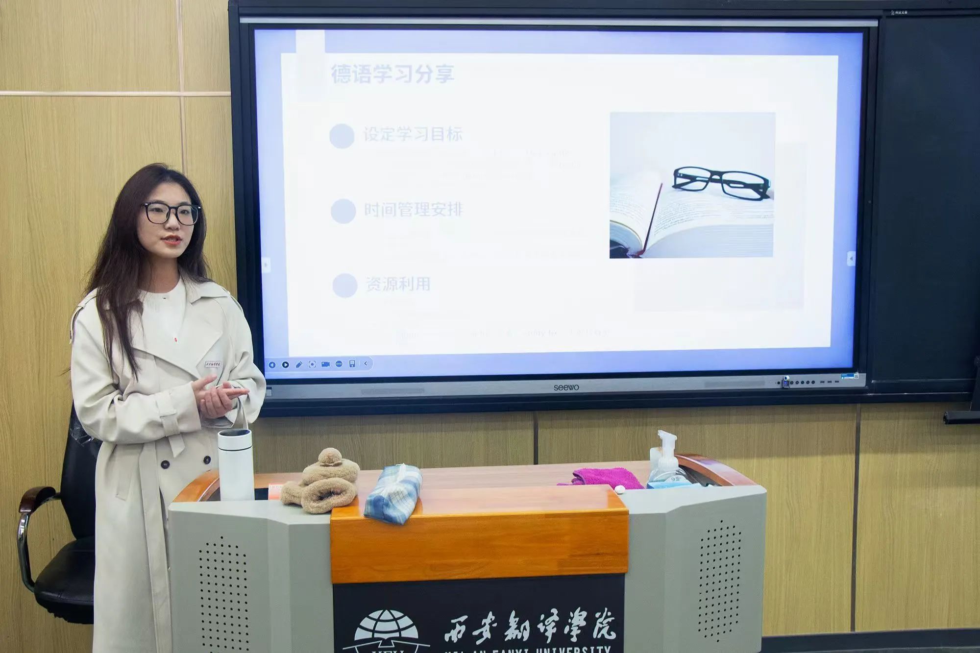 德语专业代表王嘉瑶,从学习目标、方法、经验等方面进行了深入阐述。她指出,成为优秀学生的基础是拥有积极向上的态度,并在德智体美劳各方面全面发展。在竞赛和考级方面,王嘉瑶以自己的亲身经历激励新生努力学习,争取获得专业证书。