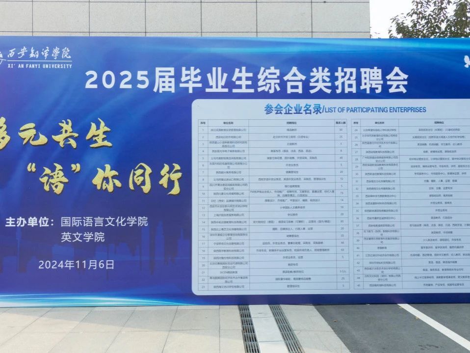 为进一步推进2025届毕业生的就业工作,搭建高质量就业平台,11月6日下午,在学校学生就业指导中心的大力支持下,国际语言文化学院和英文学院在西区五号楼广场共同举办了“多元共生,‘语’你同行”专场招聘会。