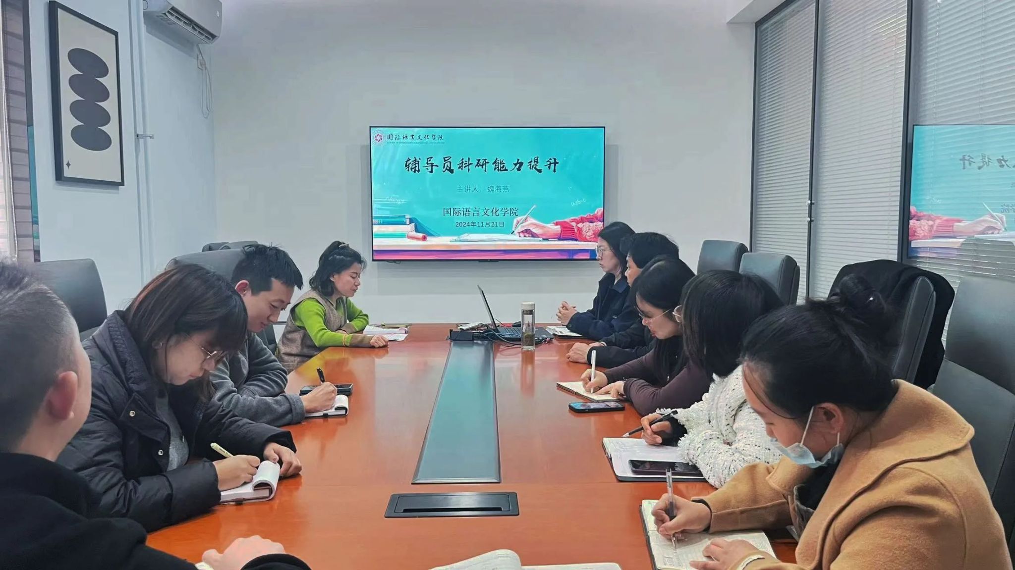 为提升辅导员科学研究能力和综合素质,促进职业生涯的长远发展,11月21日下午,国际语言文化学院召开辅导员科研能力提升培训会。学院副院长魏海燕担任主讲,党委书记、副院长宇文永康,综合办副主任尹娜,团总支书记陈福礼及全体辅导员参会。尹娜主持会议。