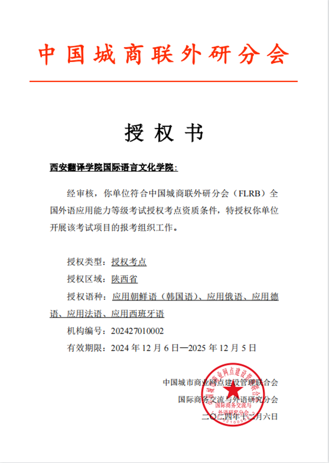 12月6日,我校国际语言文化学院成为“FLRB全国外语应用能力等级考试” 授权考点,将开展应用俄语、应用法语、应用德语、应用朝鲜语(韩国语)、应用西班牙语五个语种的考试。这不仅标志着我校外语教学和人才培养质量得到国家层面的高度认可,也为广大学生提供了更多展示自身语言技能的平台。