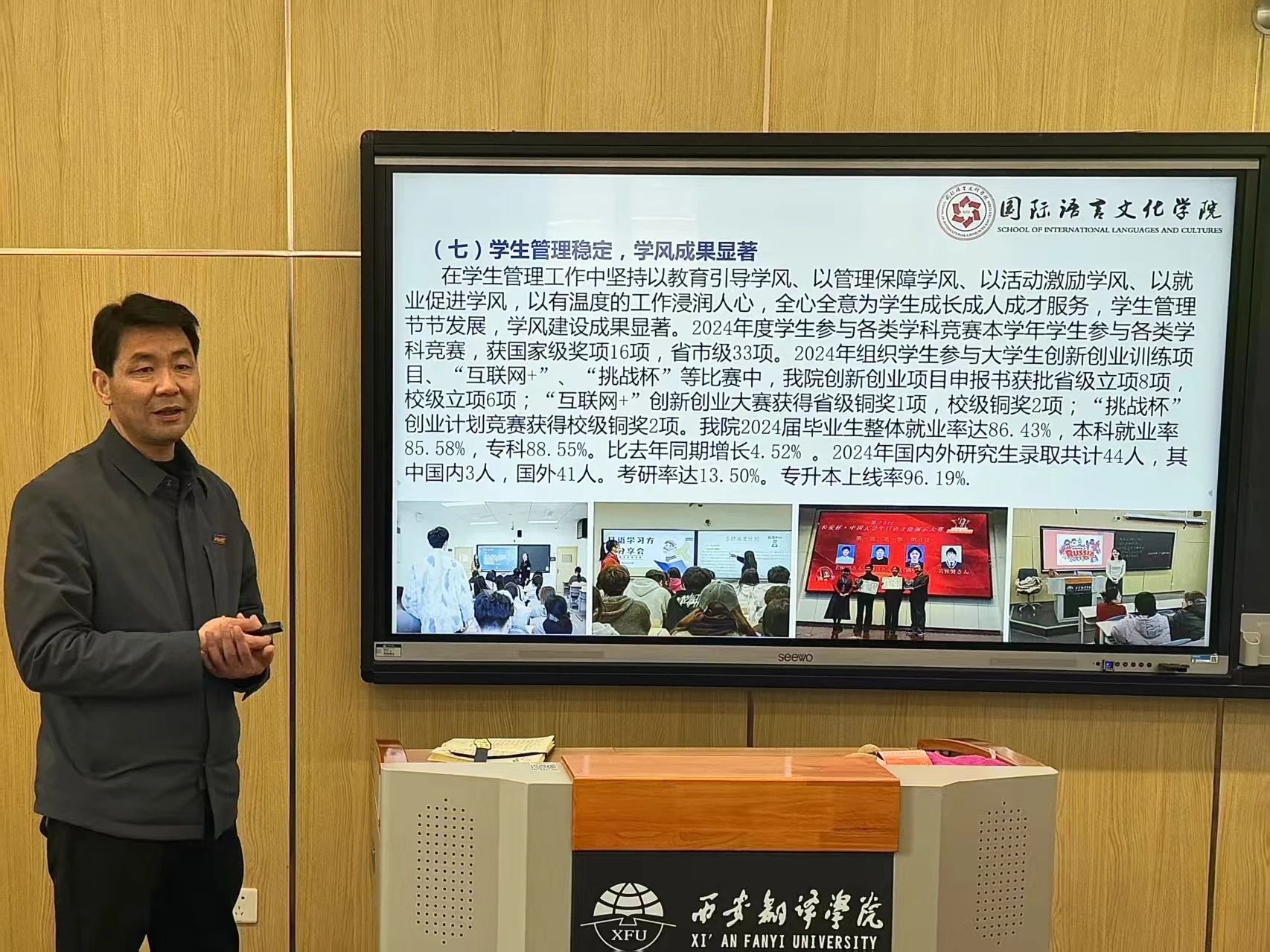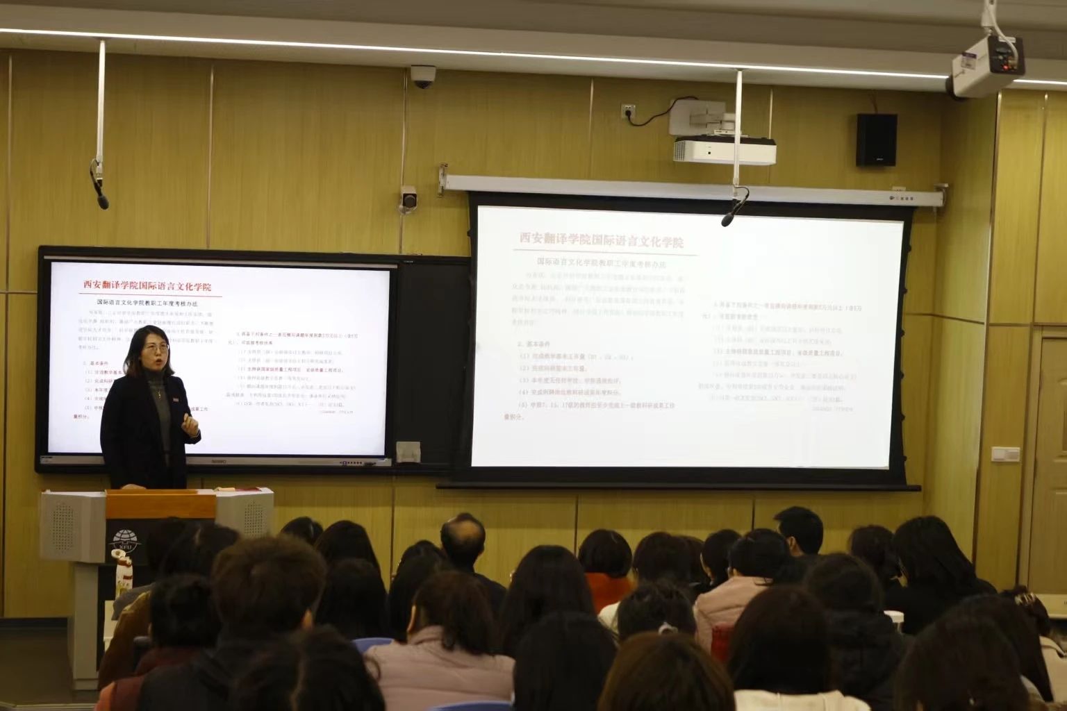 国际语言文化学院科研副院长魏海燕对2024年度学院科研、国际交流合作情况进行了汇报。她总结了学院2024年国际交流与合作工作开展情况、科研工作总结情况、课题立项及科研成果完成情况,并汇总了2025年度科研课题信息。最后,她对学院年度考核评优相关政策进行了解读,鼓励全体教职工积极参与科研工作,为学院发展贡献力量。