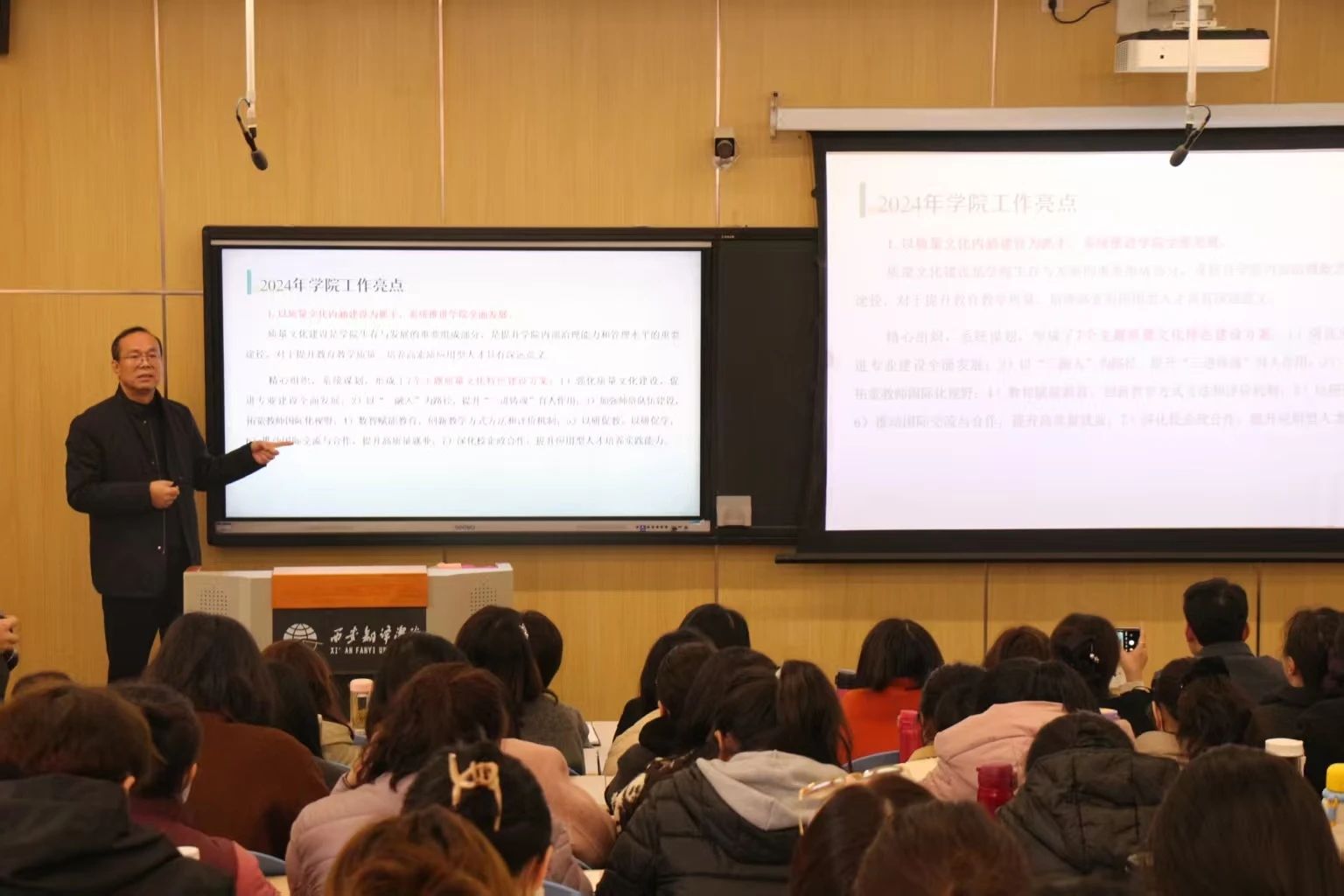 国际语言文化学院院长李庆明从质量文化建设、审核评估整改工作、专业内涵建设、课程建设、学科竞赛、师资队伍建设、科研服务能力、国际交流与合作、高质量就业等多方面、全方位地总结了2024年度工作任务完成情况,充分肯定了学院在过去一年取得的成绩。同时,他总结了2024年学院亮点工作,客观分析了学院在国家级科研项目、专业内涵建设、招生形势等方面存在的主要问题和挑战。最后,李庆明对2025年学院主要工作计划进行了强调部署,号召全体教职工凝心聚力,共同推动学院高质量发展。