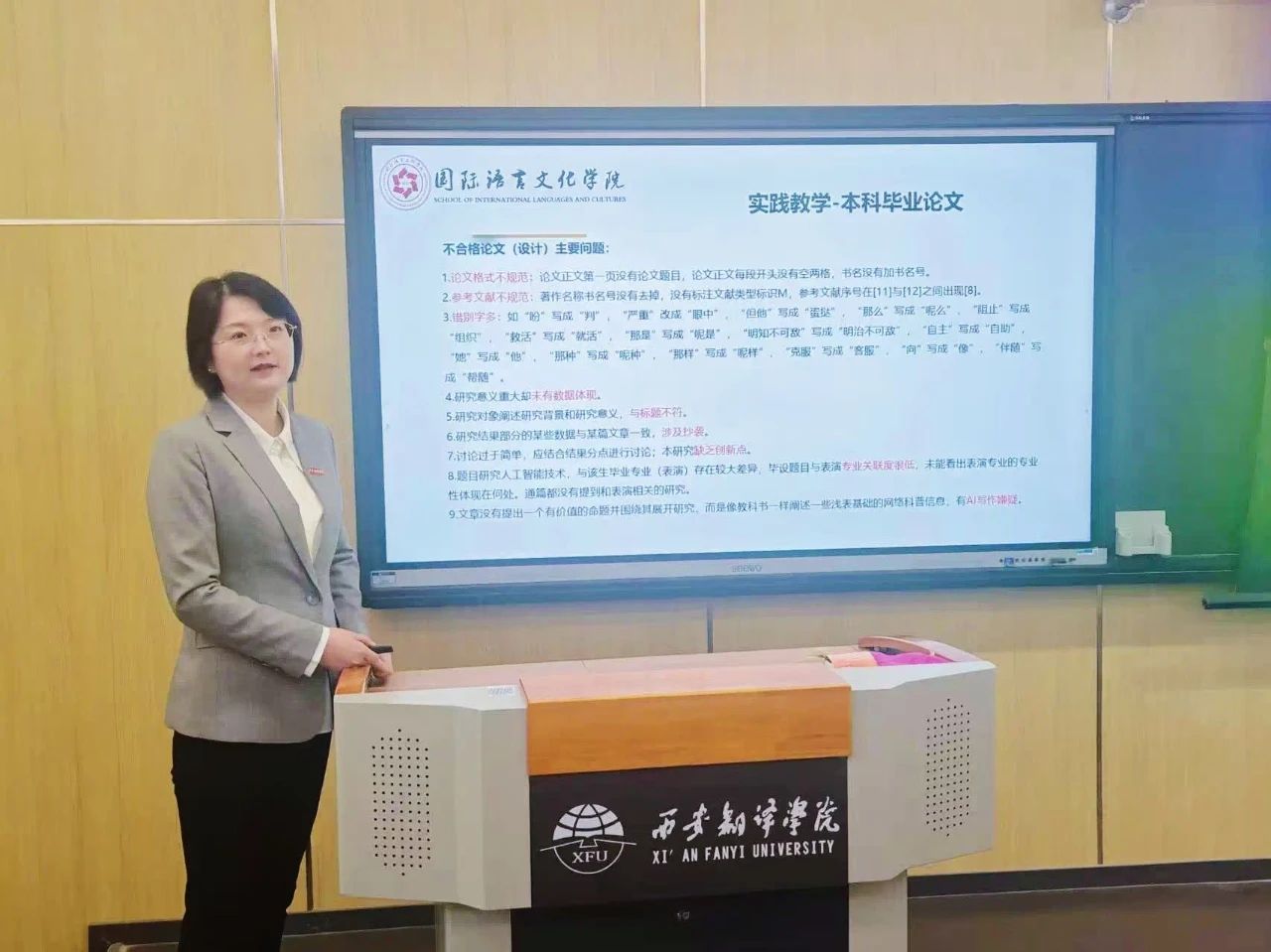 国际语言文化学院教学副院长吴震首先通报了2024年本科毕业论文(设计)教育部抽检结果,随后,她结合AI时代发展趋势,就如何更好地将课堂教学、人才培养模式、课程建设、教学研究、教学竞赛、教材建设与人工智能深度融合提出了思考和建议。吴震强调,AI不是取代教师的工具,而是放大教师价值的桥梁,教师要积极拥抱新技术,不断提升自身教学水平和能力。