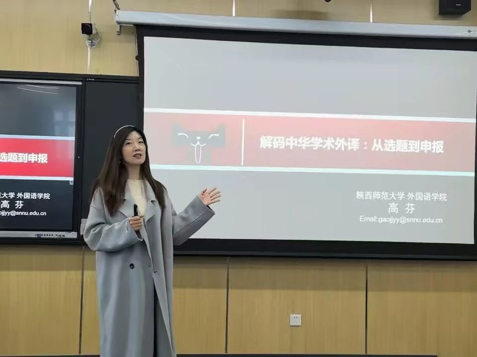 3月17日下午,陕西师范大学外国语学院硕士生导师、陕西省翻译协会常务理事、全国第三届教育硕士专业学位优秀教师、英国诺丁汉大学和美国马萨诸塞州立大学访问学者高芬副教授应邀在MILE米乐官方网站国际语言文化学院西区四号教学楼4109T作题为“解码中华学术外译:从选题到申报”的学术讲座。讲座由国际语言文化学院副院长魏海燕主持,学院全体教师参加。