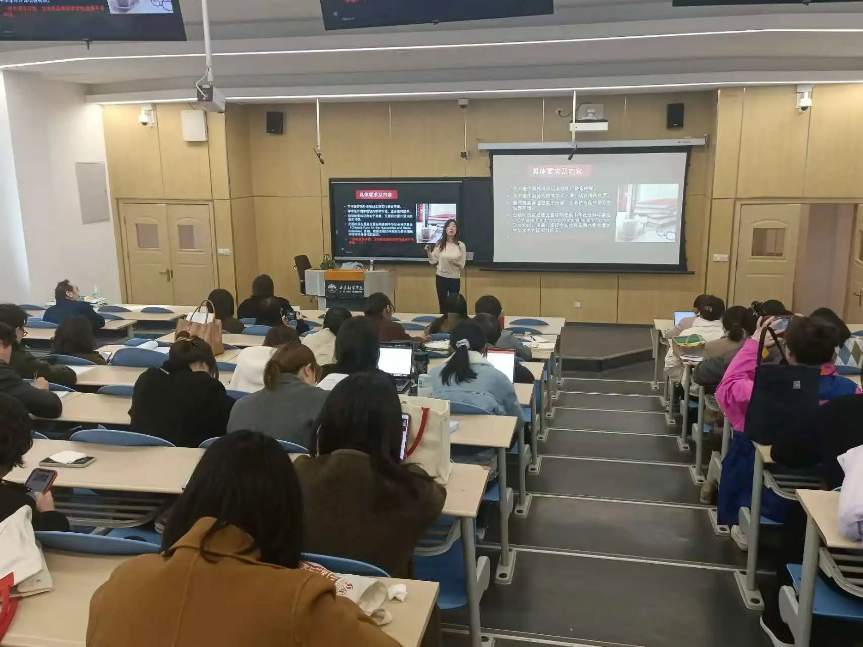 高芬副教授主要从中华学术外译的背景与意义、选题策略、翻译质量与学术规范、申报流程与注意事项、案例分享与经验交流等方面讲解了中华学术外译项目的申报情况。她指出,中华学术外译项目是国家推动中国学术“走出去”的重要举措,旨在通过翻译出版中国优秀学术著作,促进中外学术交流,提升中国学术的国际影响力。高芬副教授通过分享自己从申报到顺利结项的成功经验,详细介绍了从选题到出版的整个过程,并与台下教师进行了互动交流,解答了大家在实践中遇到的困惑。本次讲座内容丰富、实用性强,为学术外译工作提供了清晰的思路和具体的操作方法。