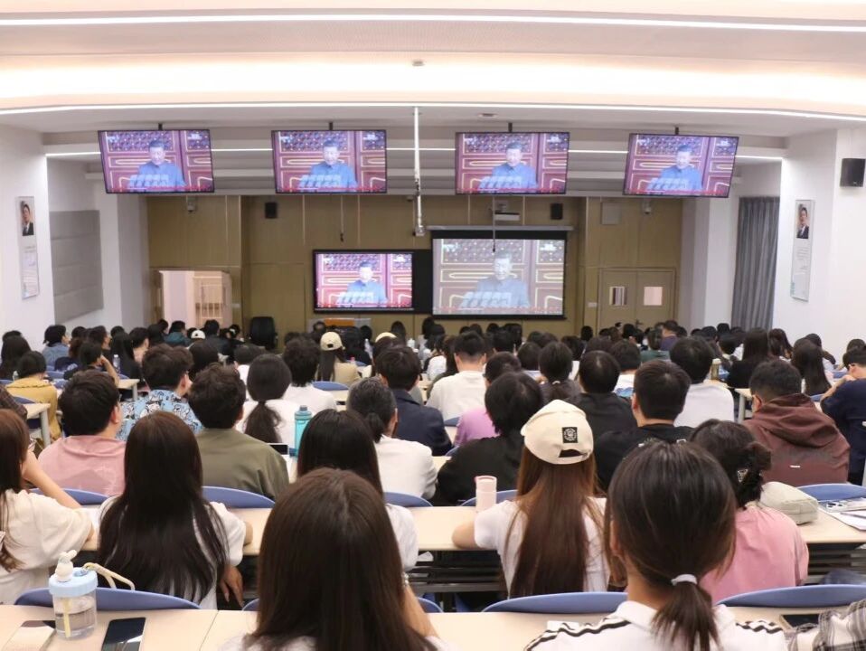 2025年9月3日上午,纪念中国人民抗日战争暨世界反法西斯战争胜利80周年阅兵仪式在北京天安门广场隆重举行。国际语言文化学院组织全体教职工、学生党员、入党培养对象及部分学生,在4102T共同观看了这场意义深远的直播盛况。学院党委高度重视这次观看阅兵活动,将其视为一堂生动的爱国主义教育课,通过集中观看直播的形式,让师生共同铭记历史,缅怀先烈,增强爱国主义情怀和民族自豪感。