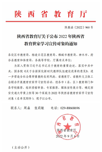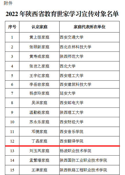 根据省教育厅相关文件精神,经各单位推荐、省教育厅资格审查、专家评价、媒体宣传展示等环节,综合考虑推荐对象的思想政治、师德表现和工作实绩,以及推荐家庭的传承性、典型性、示范性,最终,共有30个家庭入选2022年陕西省教育世家,我校理事长丁晶家庭赫然上榜。